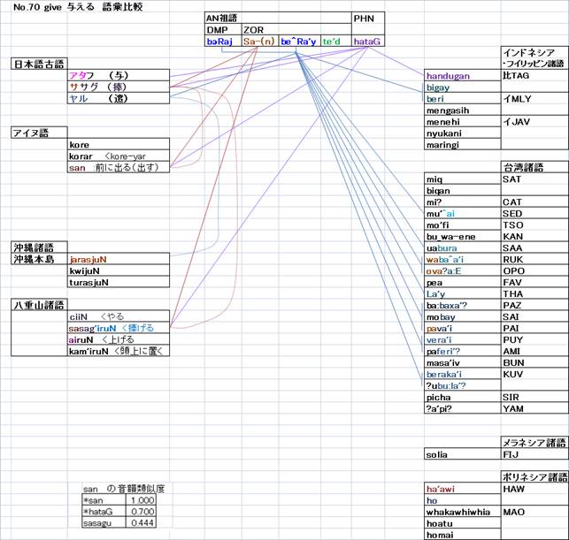 表 1.スワデッシュの基礎語彙No.70 give:与える に関する南島語比較
