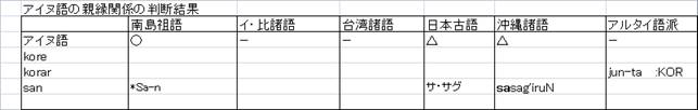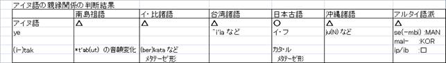 これらのアイヌ語に対する判定結果を次表にまとめてみた。