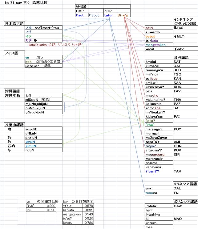 表 3.スワデッシュの基礎語彙No.71 say:言う に関する南島語比較