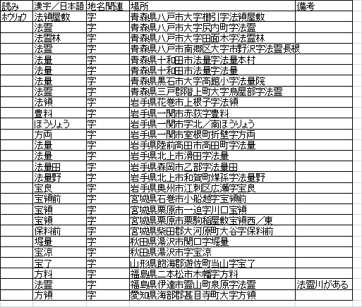 独自にホウリョウ地名を調べた結果は以下のようである。
